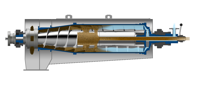 The concept is simple. The heavy sludge in the bottom of the fermenter is pumped into the decanter at a flowrate dictated by the machine size and the solids load. The liquid is separated from the solids in the mid-section of the bowl, and the screw conveys the solids out of the bowl into either a positive displacement pump or into a bin placed underneath the machine.