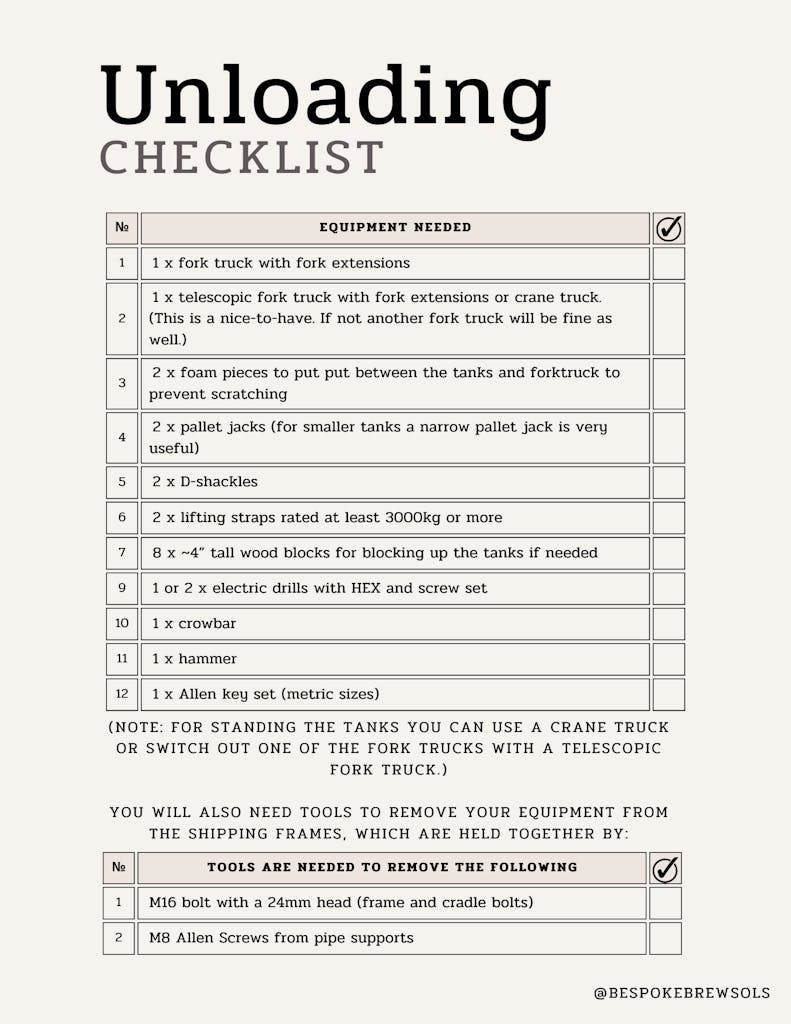 Unloading and Installing Brewery Equipment Checklist
