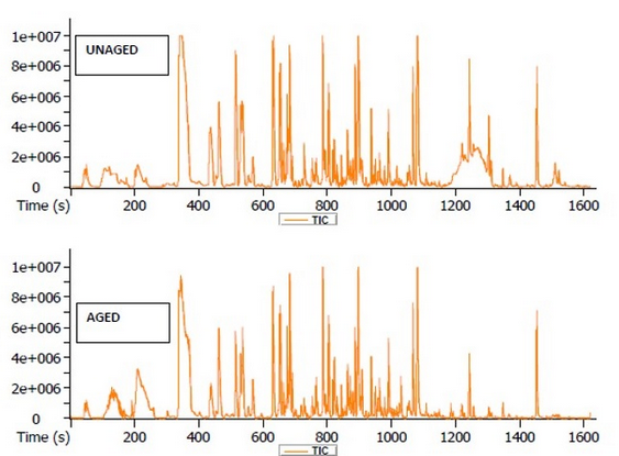 In aging there are complex chemical reactions occurring with new molecules being formed or extracted and other molecules being removed or transformed. Wood flavors are extracted from the barrel (or other former inhabitants of a used barrel), oxidation/esterification reactions form new molecules and impurities are removed through adsorption to charred surfaces. This is easily demonstrated with simple chemical analysis like the GC-MS below showing the disappearance of some peaks and the emergence