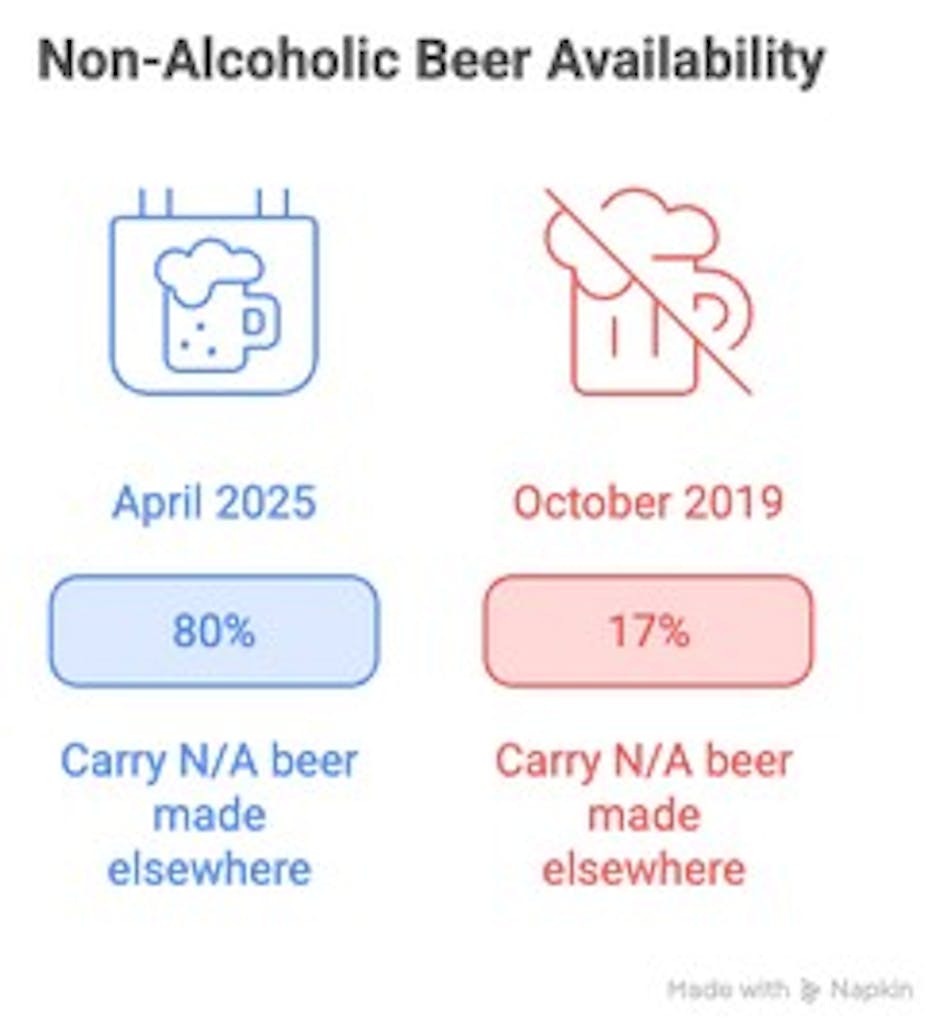 According to social media polling by Craft Beer Professionals over a span of six years, the prevalence of NA beer in taprooms dramatically shifted.