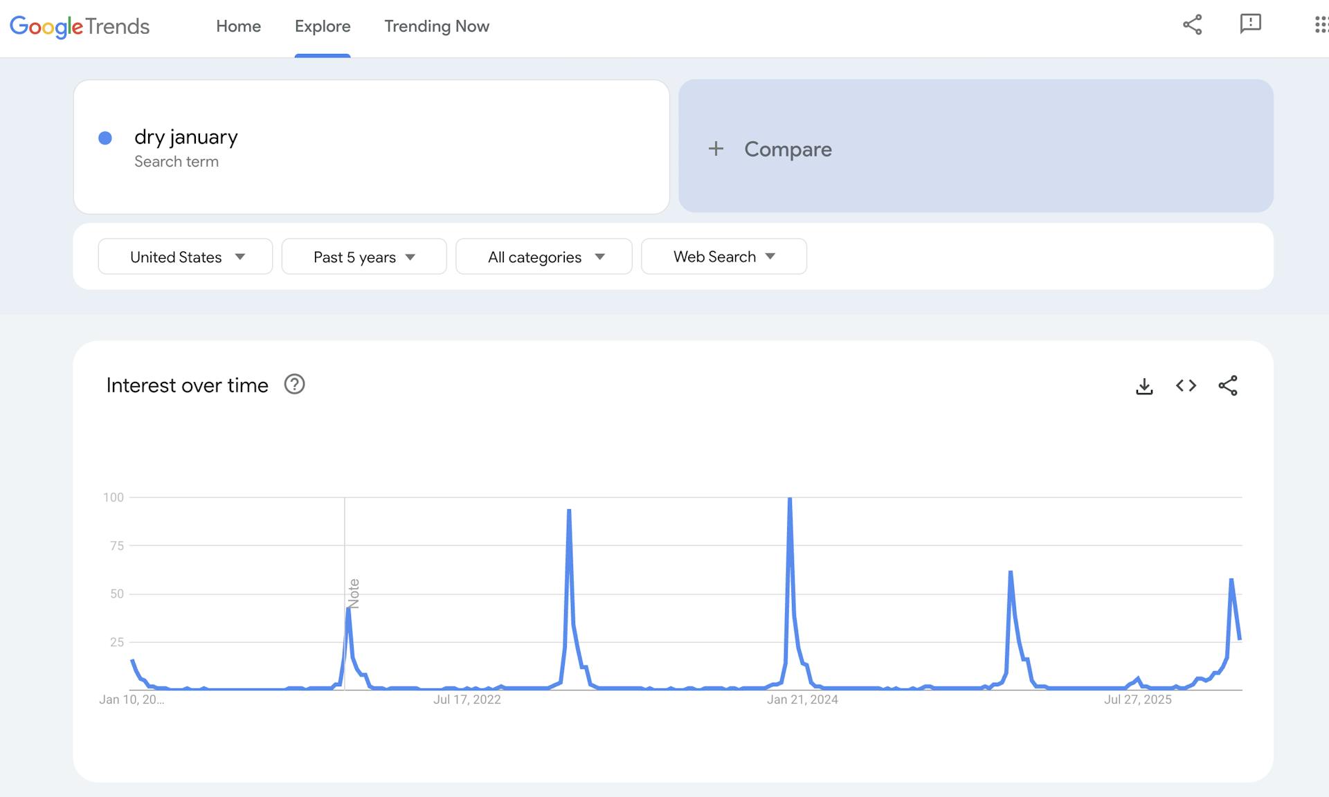 The slowing search volume suggests that “Dry January” is less popular than in 2023 and 2024. While it could mean the trend is declining, it might also indicate that the term is now better known, leading fewer people to search for a basic definition.