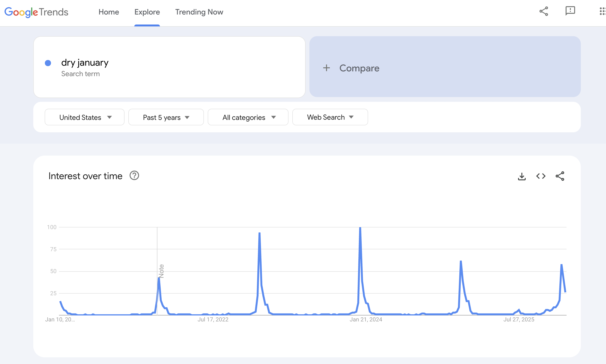 The slowing search volume suggests that “Dry January” is less popular than in 2023 and 2024. While it could mean the trend is declining, it might also indicate that the term is now better known, leading fewer people to search for a basic definition.